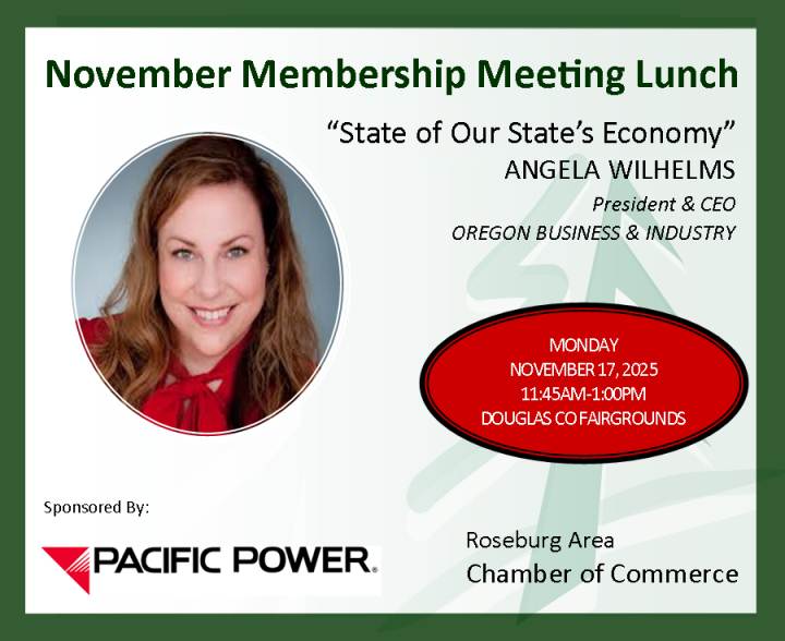 GET TICKETS! The Roseburg Area Chamber’s last membership meeting of 2025 will host a program on the state of our state’s economy. The presentation will focus on the state of business in Oregon including a recent analysis of Oregon’s regulatory impacts on business and other factors resulting in Oregon’s plummeting business ranking in the US.