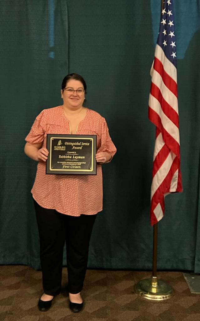 April 14, 2025 Today, at the Roseburg Area Chamber of Commerce April membership meeting lunch, Tabbitha Layman was named our 2024 First Citizen! Like her fellow 2024 First Citizen recipient, Dan Bain, Tabbitha was recognized for years of giving her time, talents and dedication volunteering in our Roseburg and Douglas County community.